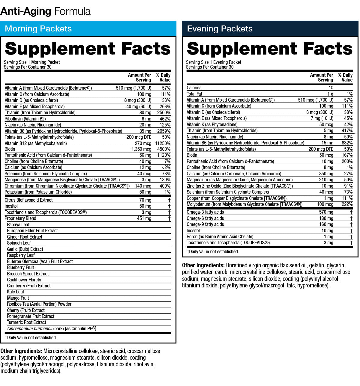 Quality – the ingredients, dosing, and formula are put together in such a manner thereby ensuring optimal absorption and utilization by the body– coupled with convenience. Like many things in life, you get what you pay for and the same is true with nutritional supplements. Anti-Aging Formula is provided morning and evening packets. The use of time, or chronotherapy, provides the right nutrients at the right time of day. In addition, divided doses ensure optimal absorption of the water-soluble vitamins. The formulation contains natural vitamins, which provide better absorption than their synthetic counterparts. The supplement also contains the right balance of vitamins & minerals to eliminate the worry about whether you’re taking the right amount, or in the right combination. And, the product contains chelated minerals for maximal absorption. The supplement does not contain any preservatives or dyes which can cause an allergic reaction in some individuals.