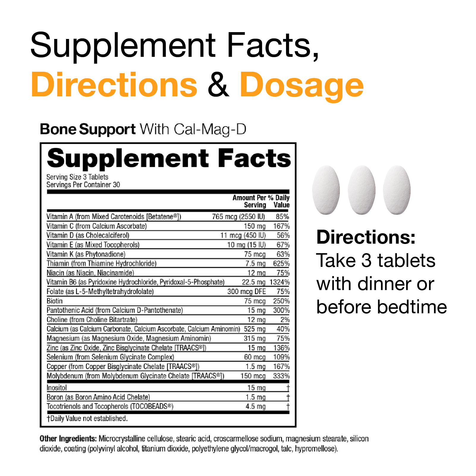 Features elevated levels of Calcium (525mg), Vitamin D (450 IU), Magnesium (315mg) plus Vitamin K and Boron to maintain bone strength and density.*
