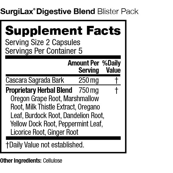 SurgiLax is formulated with Cascara sagrada plus 10 digestive herbs to promote normal, healthy bowel movements; to calm the digestive system and minimize the discomfort associated with occasional constipation; and to stimulate healthy digestive function.*